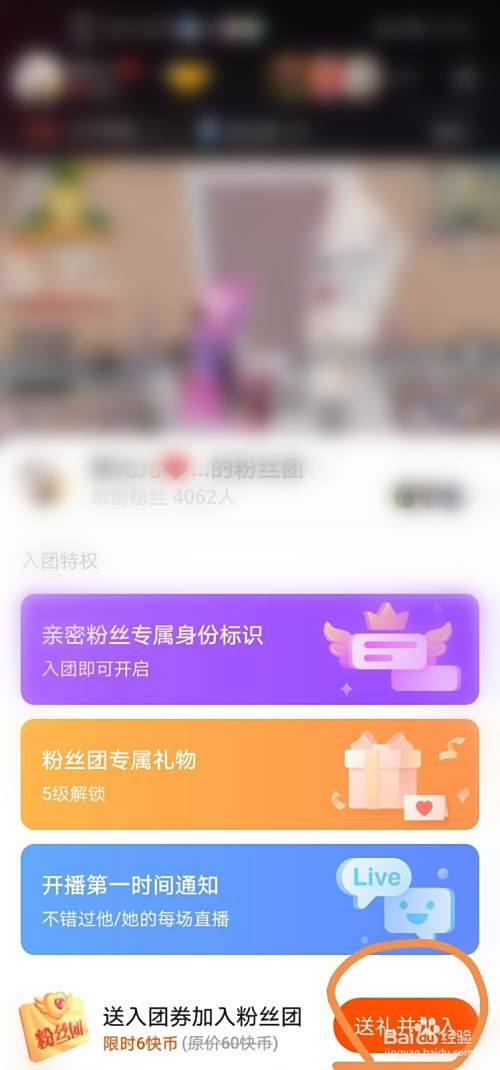 打开快手直播,界面左上角增加粉丝团入口,证明快手粉丝团功能已开启。选择你所喜爱的主播,进入直播界面,点击右上角“关注”图标。