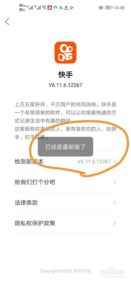 打开关于我们界面点击“检测新版本”,将快手版本更新最新版本 V6.11.6.12260。