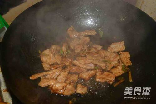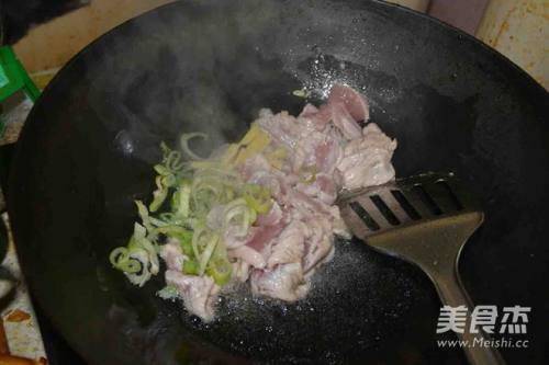 炒锅热油,一次放入瘦肉和葱姜丝翻炒