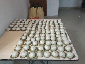 刚蒸好时,菜包很粘手,千万不可和别的菜包相碰,会粘破哦!取时拿住粽叶边就好,放桌上晾凉,记得点上红曲粉泡的水,是不是比较好看,很有食欲