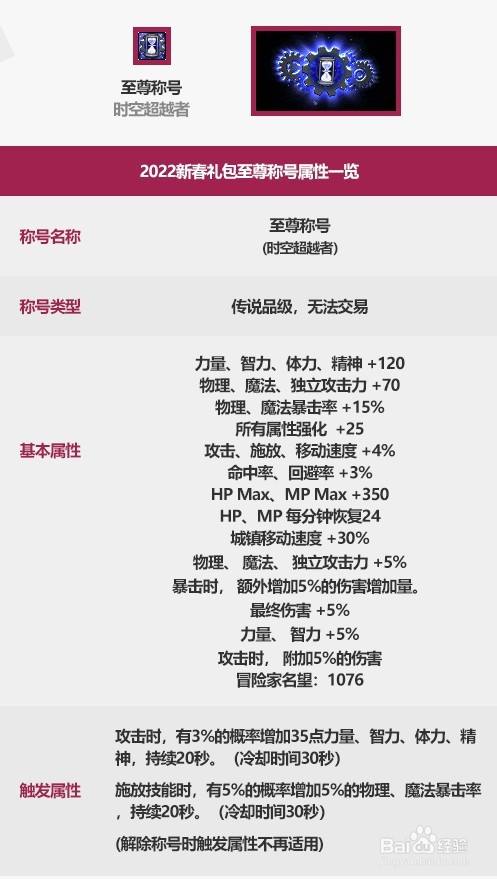 至尊称号称号名称(时空超越者)。称号类型传说品级,无法交易。力量、智力、体力、精神+120物理、魔法、独立攻击力+70物理、魔法暴击率+15%。所有属性强化+25。