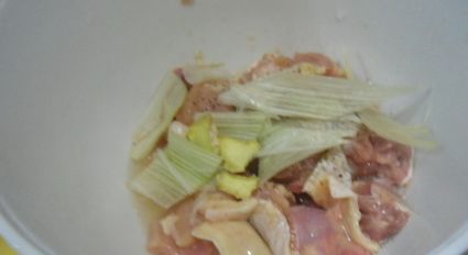 加葱姜、少许盐、胡椒粉、料酒拌匀,腌渍5分钟