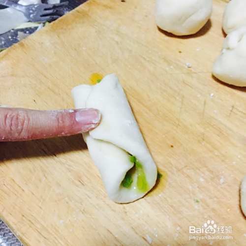 沿着长的方向再卷一下~然后~一掌按下去~按到和最开始的小饼接近的大小~