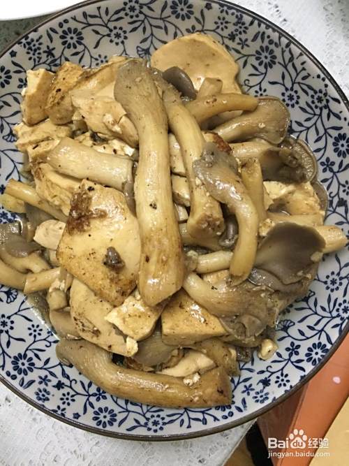 准备食材,将豆腐、平菇分别洗净,切好,待用。热锅中倒油,将豆腐入锅,翻炒几下,再加一点水