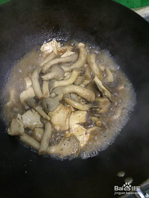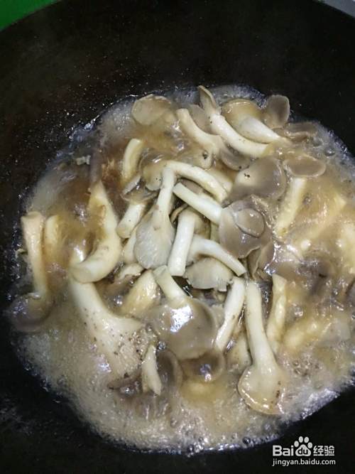大火烧2分钟左右,将平菇倒入,盖上锅盖焖一会儿