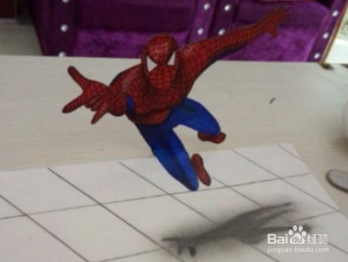 最后就是飞起来一张,对了一定要自己找好角度去拍,就是能把曲折的地方看成直线就可以了。这样蜘蛛侠怎么画全身3d就这样呈现出来了·。