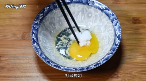 首先准备一个空碗,打入鸡蛋,加入适量白糖,打散搅匀。