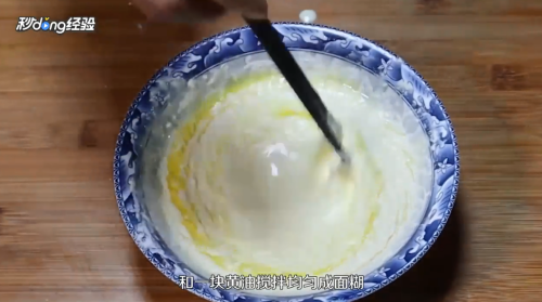 接着在碗中打入60克牛奶、40克奶油、适量面粉和一块黄油,搅拌均匀成面糊。