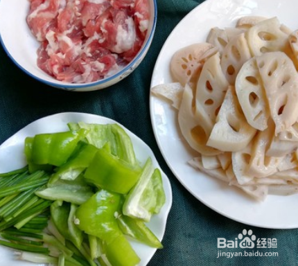 把五花肉,藕片,青椒切好放在不同的碗里面。