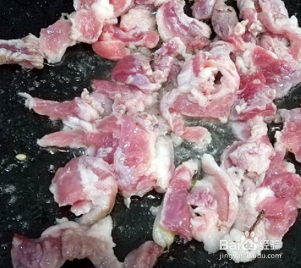 五花肉加点淀粉混匀,再把五花肉放进锅里快速翻炒至泛黄。