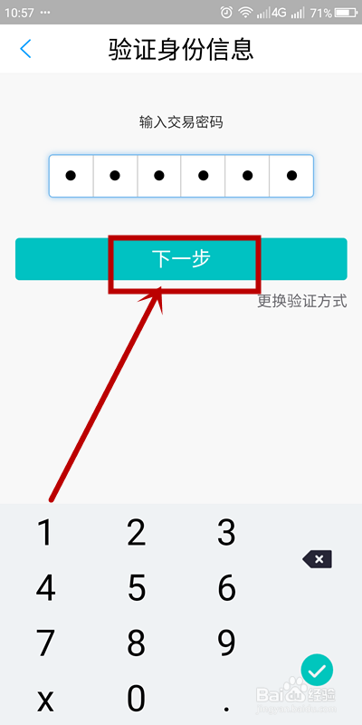 9、验证身份还需要输入交易密码,点击【下一步】