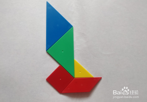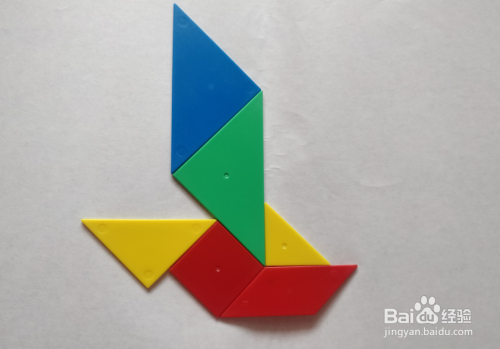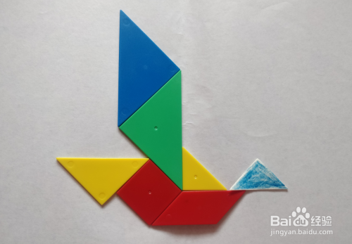 在平行四边形的右上,放上蓝色小三角形挨着,直角向上,如图。这样翱翔的大鸟就呈现出来了。