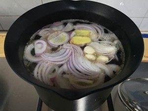 放进汤锅,加热水,一次加够,放葱姜蒜料酒,半个洋葱