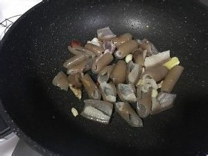 热锅热油下入姜、蒜、辣椒煸香。下入猪皮炒至变色。