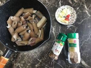 倒入清水,没过猪皮的量。大火烧开后,转小火烧1个小时左右。