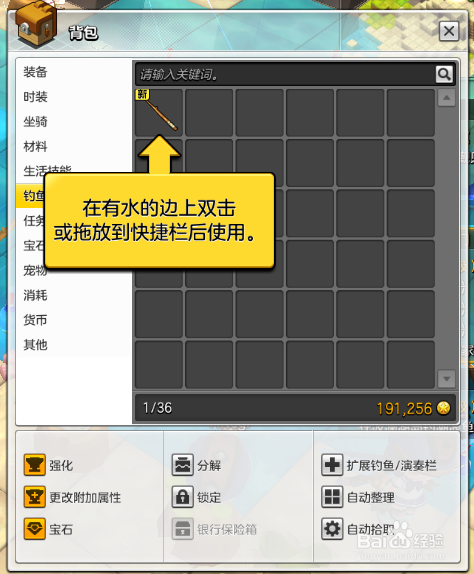 打开背包选择钓鱼/演奏,使用双击鼠标左键使用鱼竿。