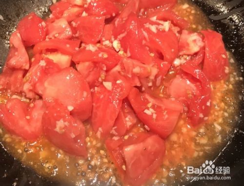 不沾锅内倒入少量食用油,烧热后,加入蒜末,爆炒出香,再加入番茄,翻炒出汁。