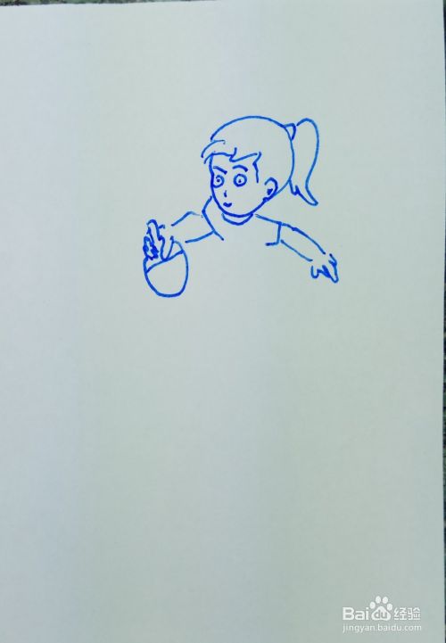 用线条和曲线画出她的两条胳膊,并画出她右手里拿着的乒乓球拍。