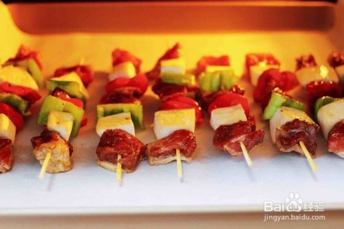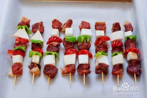 竹签提前用清水浸泡一会儿,所有的食材准备好后。取一根牙签,一块肉,一款杏鲍菇,一块彩椒,这样串起来,依次串完所有的牛肉,烤盘垫上油纸,将串好的牛肉串放入烤盘中。