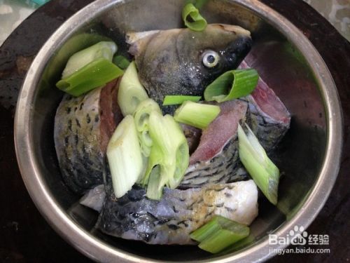 鱼段入盆加入黄酒1汤匙、白胡椒粉、葱段和盐腌制20分钟