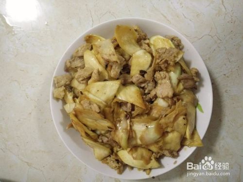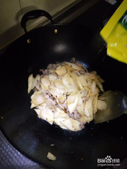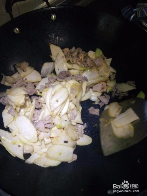 5、茭白炒熟后加肉一起煸炒,倒入酱油,食用盐等
