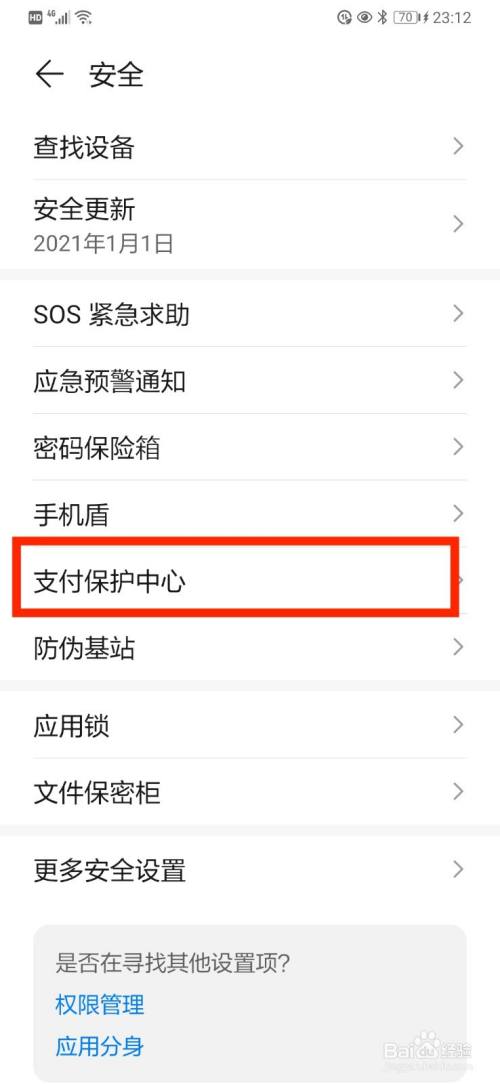 在打开的安全设置页面,打开【支付保护中心】设置项,如下图所示。