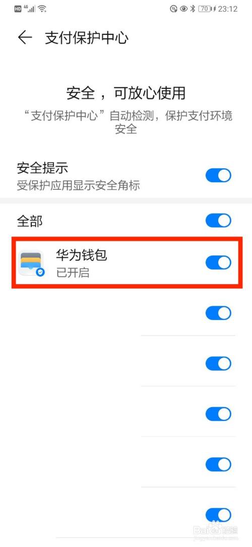 进入支付保护中心设置页面,在支持支付受保护应用列表中,开启保护开关操作即可。如下图所示。