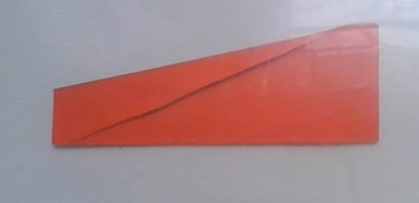 将纸飞机的左上角沿如图所示线条向下折叠,直至左部上角与底边重合,压实折痕。注意该线条左端与左下角的距离和右端与右上角的距离是大致一样的,大约5厘米。纸飞机的另一侧也这样折叠