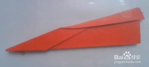 将纸飞机的上部沿通过右上角与靠上的斜边的平行线向下折叠形成侧襟翼。再沿如图所示线条在合适位置向下折叠行成机翼。另一侧也这样折叠