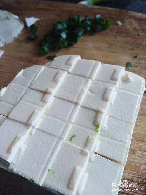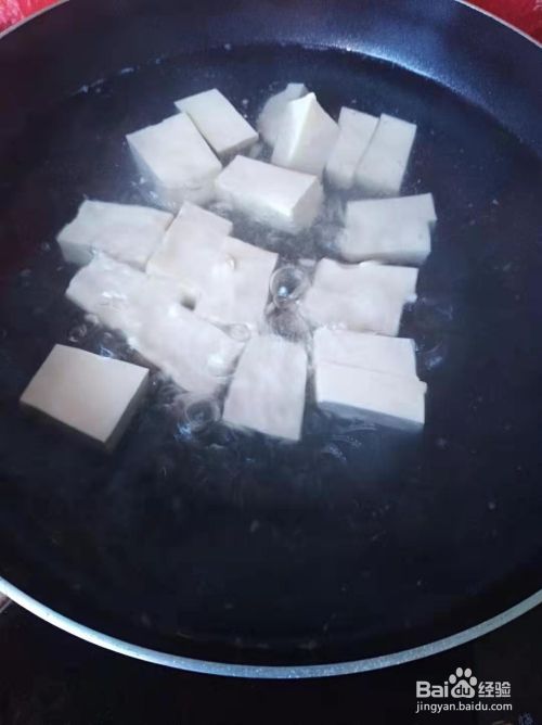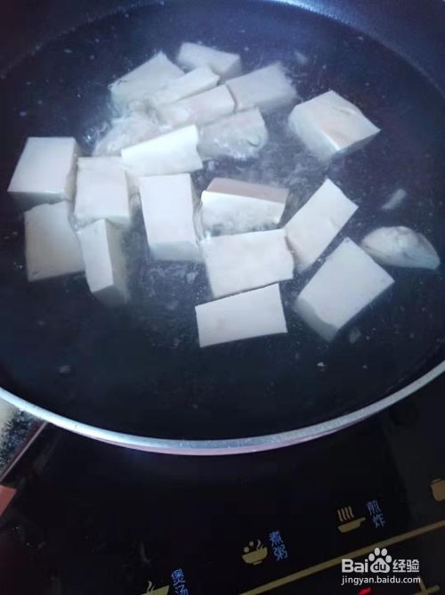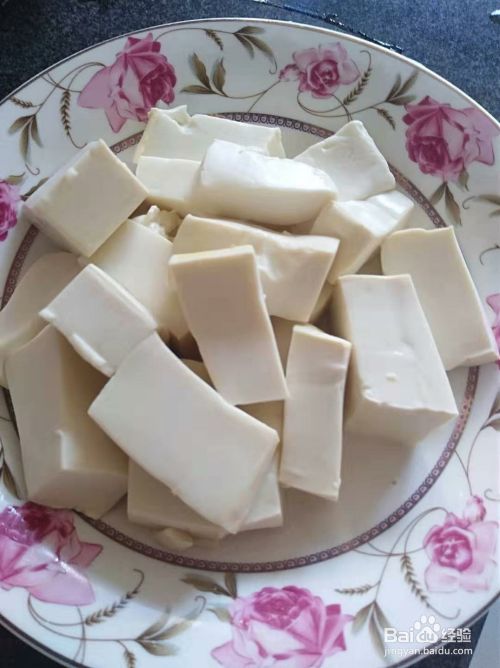 选嫩豆腐一块,切成小块,下开水中捞上1-2分钟;