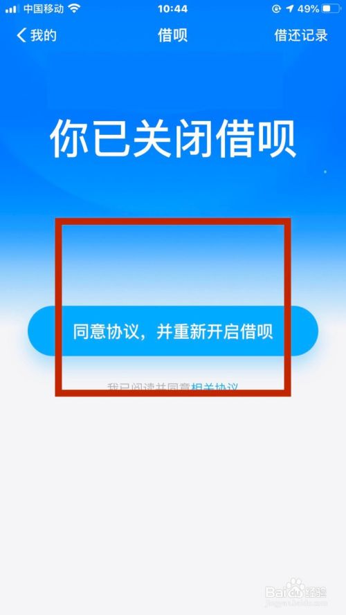 点击“同意协议,并重新开启借呗”,待显示“开启成功”即可使用
