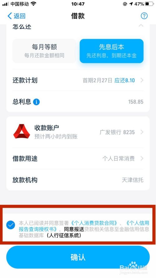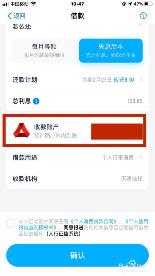 接下来,绑定银行卡,需要在本人名下的储蓄卡,最后阅读相关协议,并勾选协议,点击“确认”完成。贷款一般在20分钟左右发放到绑定的银行卡。