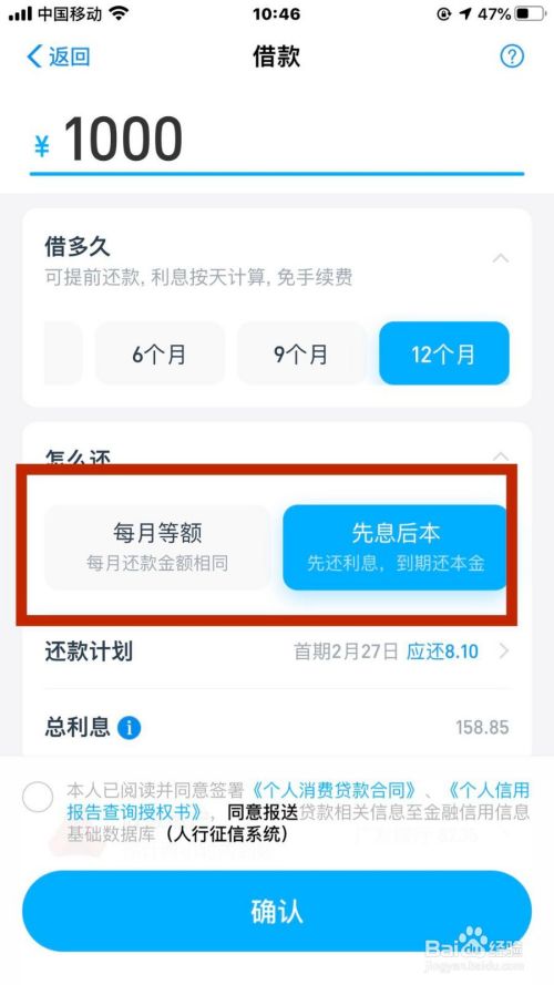 选择“还款方式”包括“每月等额”或者“先息后本”,之后点击“还款计划”了解具体明细情况