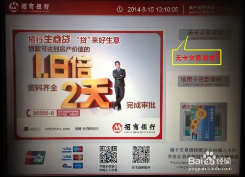 就近找到招商银行的ATM机,开始一下操作。主界面选择“无卡交易”--“无卡取款”,可以按照屏幕显示选择键盘,或者对应的按键。