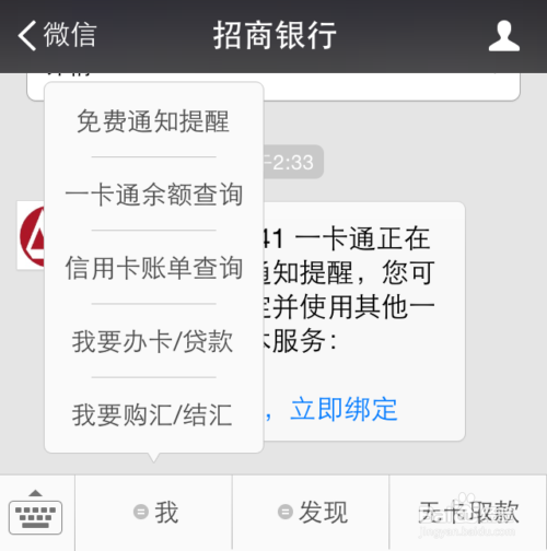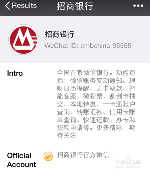 1、微信关注“招商银行”,并绑定招商银行储蓄卡。微信公众号:cmbchina-95555