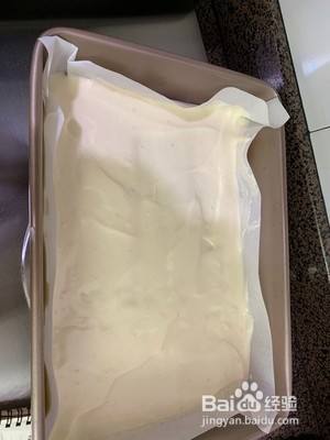 先取三分之一蛋白跟蛋黄液翻拌均匀,在将蛋黄液加入蛋白霜里翻拌均匀铺烤盘里,烤盘大小34.5乘以25,烤好之后倒扣将纸撕起来晾凉,纸照样铺在蛋糕上防止变干,晾凉之后就可以卷了