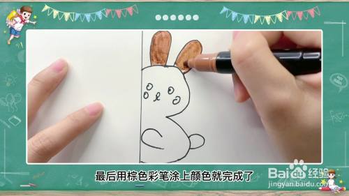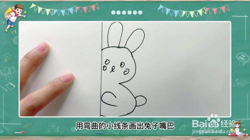 然后用半个椭圆形画出兔子的尾巴和手,接着用两个圆圈画出小兔子的眼睛,用弯曲的小线条画出兔子嘴巴