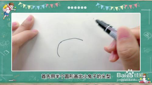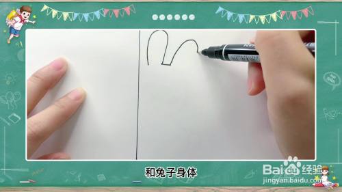 首先用尺子画一条线表示墙面,接着用圆圆的线条画出兔子耳朵和兔子身体。