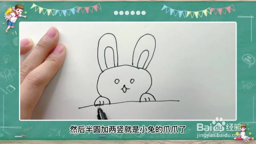 接着用四个半椭圆画出兔子耳朵,然后用两个小圆圈画出兔子眼睛,然后半圆加两竖就是小兔的爪爪啦。