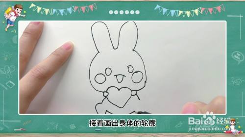接着画出身体的轮廓,再画两个小圆当作脚的细节,然后画两个圆当兔子耳洞。