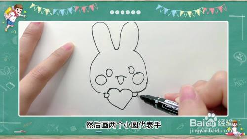 首先用弧线画出小兔的脸型,然后用半椭圆画出小兔的耳朵,接着用圆形画出小兔的眼睛和腮红形状,然后用一条弯弯的线和一个u画嘴巴,接着画一个爱心,然后画两个小圆代表手。