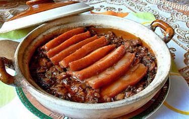 5、炒锅中少许油,炒香花椒,加入橄榄菜,酱油和糖调匀后盖在肉上,然后上锅蒸半小时,出锅后倒扣即可。