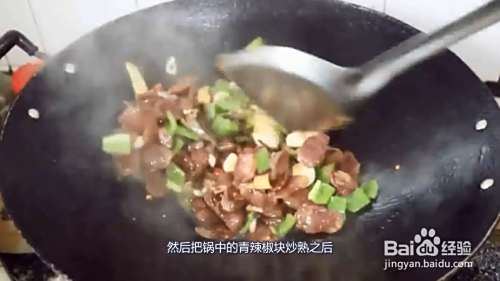 然后把锅中的青辣椒块炒熟之后,就可以关火出锅了,一道简单的腊肠就制作完成了。