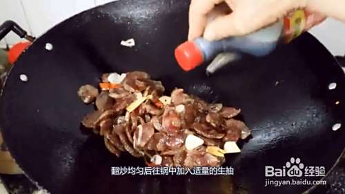 翻炒均匀后往锅中加入适量的生抽,翻炒均匀后加入青辣椒块翻炒均匀。