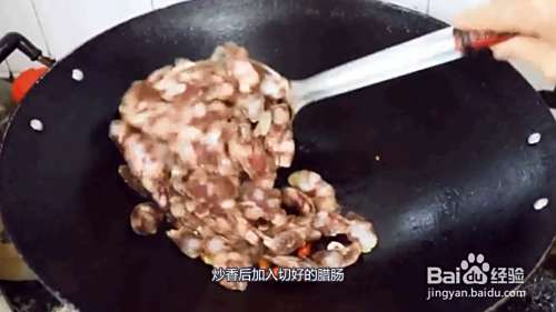 炒香后加入切好的腊肠,腊肠炒香后往锅中加入适量的盐,和适量的大蒜。