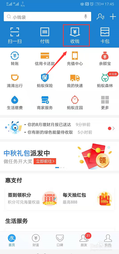 进入到支付宝首页后,选择页面上半部分的艳物廊【收钱】选项,点击进入收钱的详细页面
