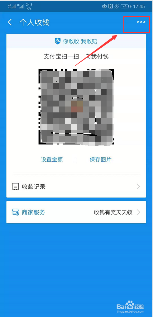 进入【个人收钱】详细页面后,可以看到收款的二维码,点击右上角的更多按钮