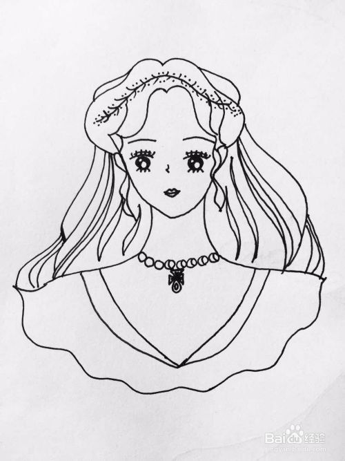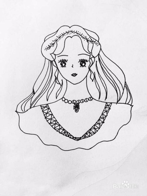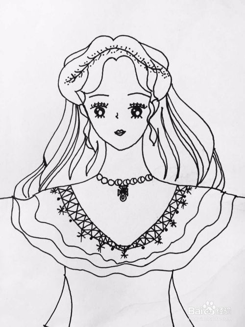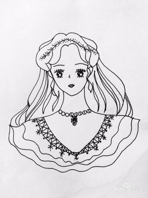 基本上卡通长发公主的形象已经出来了,接下来就是细节的处理。卡通长发公主的眼睛里除两个圆圈,其他部分用黑色碳素笔填色。画好项链和领口的装饰,一个美丽的卡通长发公主就画好了。每个人对于美得看法都不一样,经过不断练习,相信你画成之后一定会有诸多灵感再创作。欢迎超越!如果这篇文章对你有所帮助,请为茉莉小编投上一票!期待你的画作!