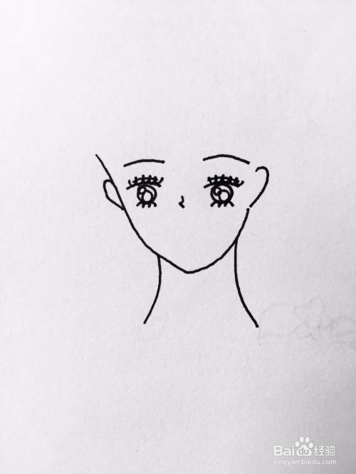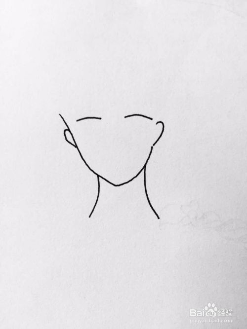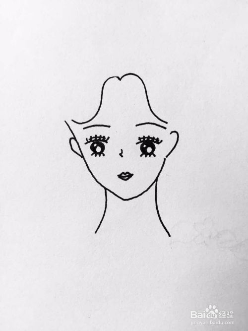 首先是画头部,头部分两笔勾勒,形状呈花朵花瓣型。观察饱满的花瓣样式,照着下图练习。用笔要适力,不可执笔过度,产生抖动歪斜就不好了。线条柔和的瓜子脸型显得人物形象年轻富活力,是卡通长发公主的完美诠释。依次画好耳朵、眉毛和双眼皮,具体参考请看图。