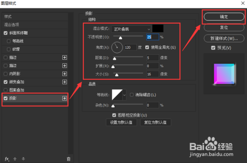 我们在投影里面,把投影颜色设置为黑色,不透明度为【25】%,角度为【120】度,距率为【5】像素,大小为【16】像素,点击【确定】。